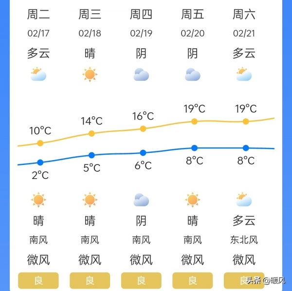 2月18-19日(初二至初三):晴,气温稳步回升,最高温12~14℃,最低温2~5℃,阳光充足,最适合走亲访友、近郊游玩。