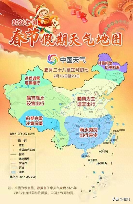 两波冷空气,一波压除夕,一波收假期;中间大段晴天暖阳,完美覆盖拜年、出游高峰。