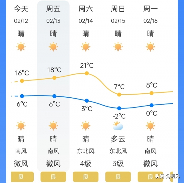 2月13日:晴间多云,风力减弱,最高温16~18℃,暖意明显。