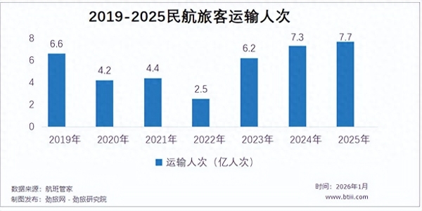 来自航班管家的统计显示,2025年我国民航完成旅客运输7.7亿人次,同比2024年增长5.5%,同比2019年增长16.7%,旅客运输创历年新高。