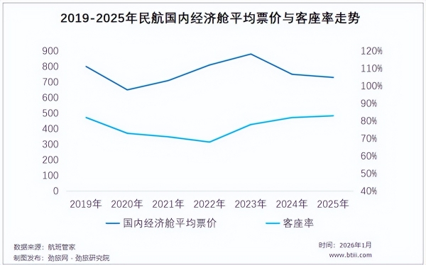 2024年国内航司经济舱平均票价同比下滑12.7%;2025年航司依旧延续低票价策略,全年经济舱平均票价达738元,同比下滑3.1%,简而言之就是所谓的"旺丁不旺财"。