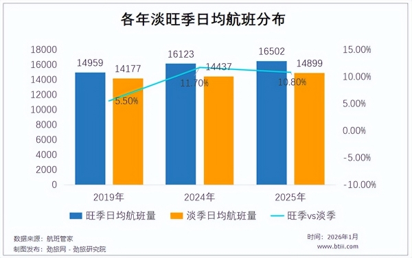 2019年,国内旺季和淡季日均航班量分别为14959班和14177班,差额为5.5%;2024年,我国旺季和淡季日均航班量分别为16123班和14437班,差额迅速扩大到11.7%;尽管2025年这一差额有所缩小,但依然达到10.8%。