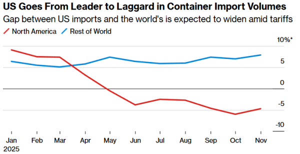 麦考恩的全球集装箱数据分析进一步印证了这一转变:北美进口量(其中美国约占总量六分之五)的增速已从全球领先转为落后。2025年11月,北美进口量同比下降3.9%,而全球总量增长7.2%。