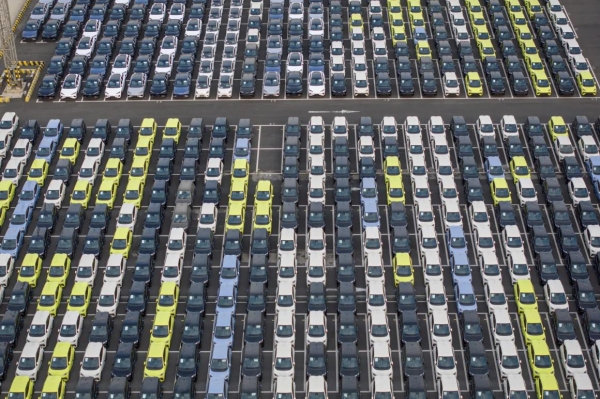 (大量中国电动汽车正在等待装船运往海外)