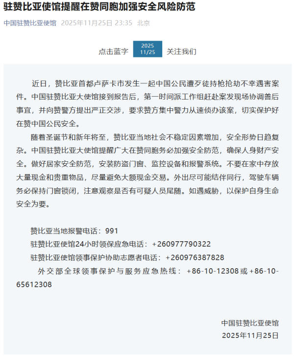据中国驻赞比亚使馆微信公众号消息,11月25日,中国驻赞比亚使馆发布安全提醒: