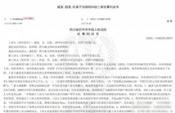 事情得从2016年说起,戚女士和程女士因为常来常往成了朋友,谁也没想到这关系底下藏着事,2022年某天,杜先生喝醉了,手机被老婆翻出来,微信里头全是"老公""老婆"这样的叫法,还有老是转520、1314这些数,一下子全露了馅,戚女士后来查了,知道丈夫从2018年就跟程女士搞在一块,四年里一直往她那儿转钱。