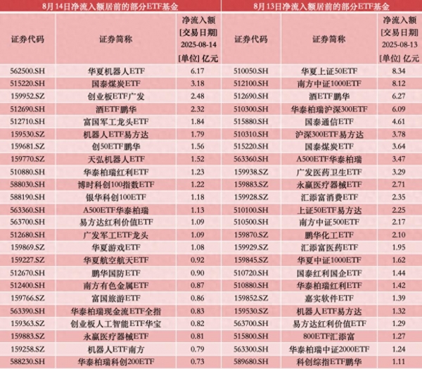 宽基指数方面,广发创业板ETF最受青睐,8月14日的净流入额为2.48亿元;鹏华创业板50ETF、博时上证科创板100ETF、银华上证科创板100ETF、华泰柏瑞中证A500ETF的净流入额分别为1.56亿元、1.22亿元、1.18亿元、1.13亿元。