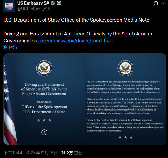 "美国以最强烈的措辞谴责南非政府最近拘留美国官员的行为,"美国驻南非大使馆在社交媒体X平台发布声明称,"此外,公开我们美国官员护照信息是一种不可接受的骚扰行为。"