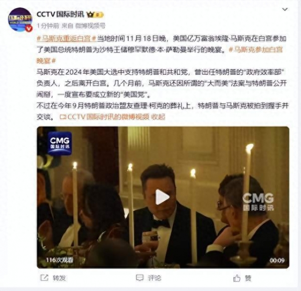 报道称,马斯克此次出席晚宴引人注目,毕竟他与特朗普在今年早些时候关系破裂,并在社交媒体上展开了激烈的言辞对战。但9月,两人在查理·柯克葬礼上被拍到进行了互动。