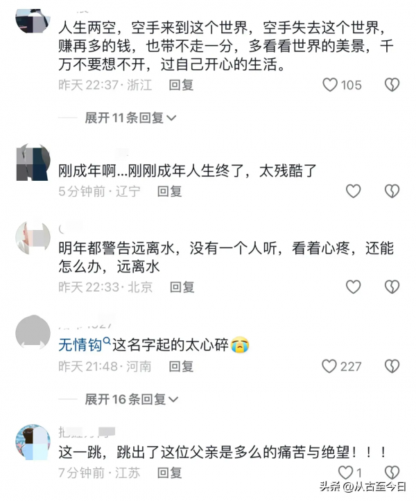 也有网友表示,父亲的这一跳,跳出了父亲是有多么绝望多么痛苦啊!刚成年啊,年纪轻轻的,世间还有数不尽的美好待你去享受啊!