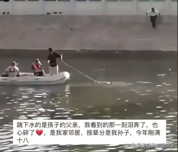 救援人员把孩子捞上来的时候,父亲在岸边再也忍不住了,心痛得跳进了河里,朝着孩子游过去。这场面,真是让人心碎。