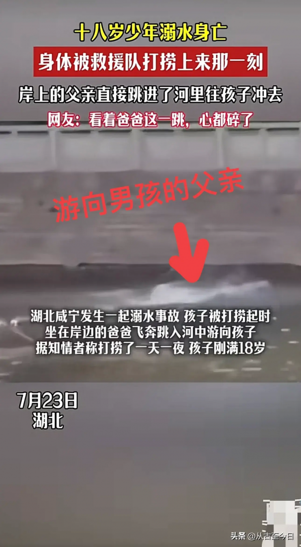 2024年7月23日,湖北咸宁的一个小男孩不小心溺水了。救援队找了整整一天一夜,终于在第二天把孩子的遗体找到了。孩子的父亲一直在岸边等着,心急如焚。当看到孩子的遗体浮上来,他再也坐不住了,直接跳进了河里,游向自己的孩子。