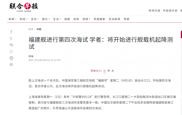 新加坡《联合早报》援引开源情报信息,证实了在9月3日当天福建舰离开港口正式开展第四次海试。且根据对中国各地区海事局发布的航行管制通告进行分析,外界基本确信福建舰的海试位置在黄海北部。
