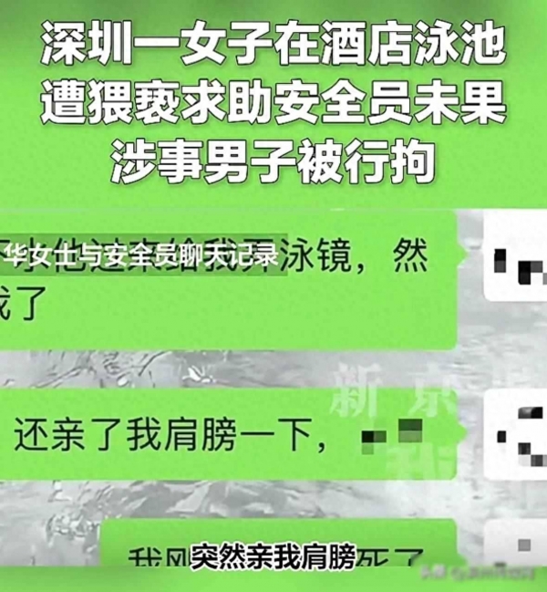 3月25号晚上,深圳一家雅诗阁酒店的泳池里,华女士正在游泳,一个男住客凑过来,说要帮她调泳镜,手却直接搂住她的腰,她当场喊救命,现场的安全员站在那儿愣了几秒,等那人走了快五分钟,才慢悠悠走过来问情况,华女士气得手发抖,事后报了警,警方查实后给了那男的行政拘留8天,处罚书她也公开了。
