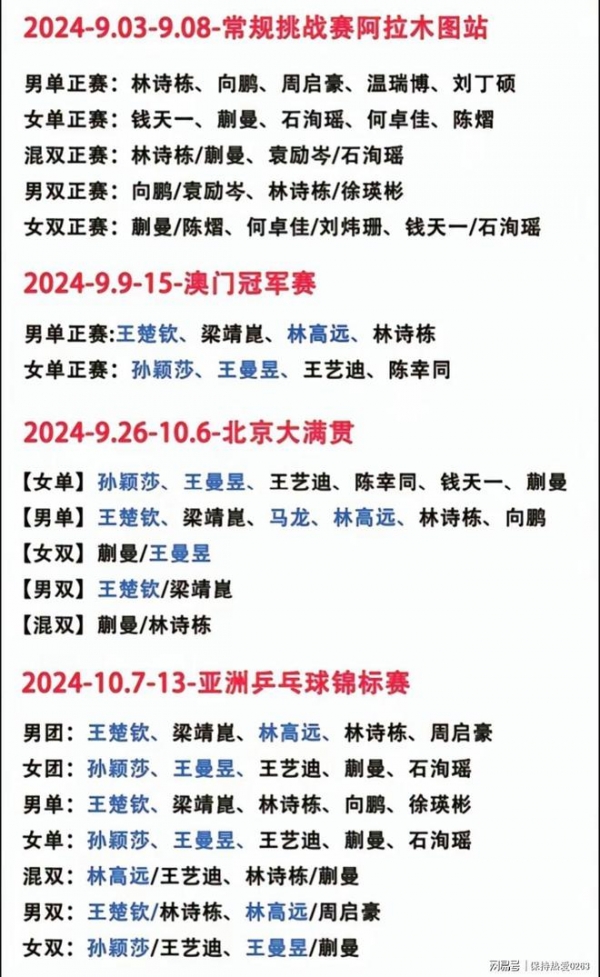 相信很多球迷都知道,在结束巴黎奥运会之后,国乒又迎来了三场赛事,根据国乒给出的参赛名单,新奥运周期阵容也正式揭晓了。从阵容当中,我们可以看得出来,莎头混双已经正式拆分,国乒培养了新的混双,那就是蒯曼和林诗栋组合,而王楚钦和孙颖莎则是把重心转移到了单打,毕竟两人都需要在单打取得成绩,继续身兼三项对他们单打成绩影响太大。