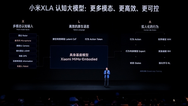 在智能电动车领域,本次发布会上,小米HAD升级最新小米XLA认知大模型,采用Xiaomi MiMo-Embodied作为基座模型,该模型为首个实现自动驾驶与具身机器人统一认知的基座架构,赋予系统强大的语言和空间推理能力。