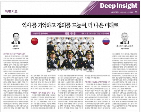 据中国驻韩国大使馆消息,8月29日中国驻韩大使戴兵与俄罗斯驻韩大使季诺维也夫在韩国《亚洲经济》《亚洲日报》以中韩双语,发表题为《铭记历史、弘扬正义,共创和平美好未来》的联合署名文章。