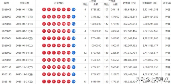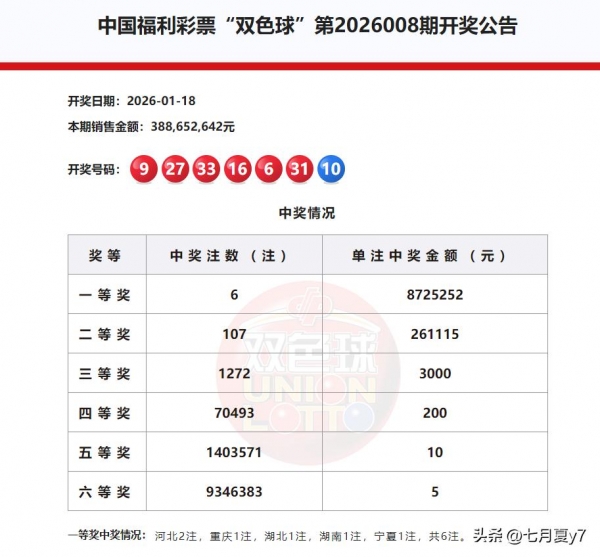 中国福利彩票"双色球"第2026008期于2026年1月18日完成开奖,本期全国销售金额388,652,642元,开奖号码为红球9、27、33、16、6、31,蓝球10。