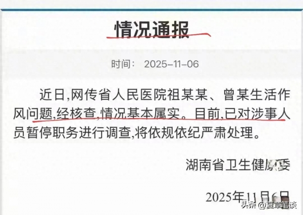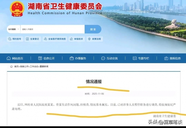 11月6日,湖南省卫健委发布正式通报,确认视频内容基本属实,两人已被停职调查,后续将依法依规处理。