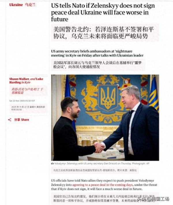 英国媒体《卫报》的报道截图:美国陆军部长丹尼尔·德里斯科尔向乌克兰当局,泽连斯基下达最后通牒