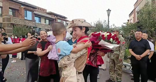 9月4日,天津一位刚刚参加完九三阅兵的女民兵凯旋归来,身披红绶带、穿着迷彩服步入住宅小区,小区瞬间沸腾,锣鼓声、鲜花,还有母女深情相拥的画面,将这个属于个人和家庭的高光时刻推向了 巅峰 。