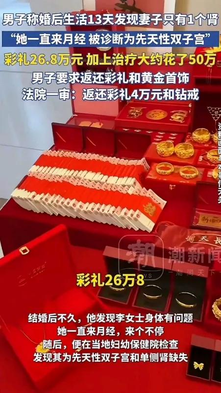 江西南昌,男子花 26.8万彩礼娶老婆,老婆却一直来大姨妈不能同房。婚后 13 天去医院一查,发现老婆只有一个肾,双子宫,但男子义无反顾地给老婆治疗,彩礼加上治疗大约花了 50 万,但老婆知道男子家没有钱后,却不愿意生活,要求离婚。