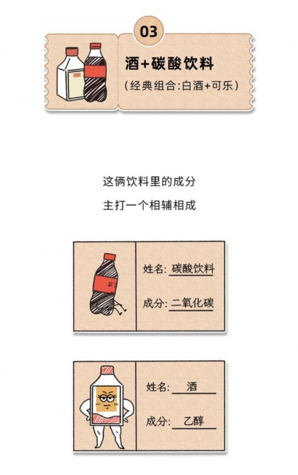 可乐里的二氧化碳,会撑开胃壁,让酒精更快进入血液,醉得更快、更猛。
