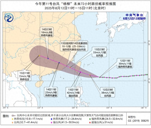 据中央气象台消息:预计,台风"杨柳"将向偏西方向移动,强度逐渐加强,最强可达强台风级(42~48米/秒,14~15级),将于13日中午前后在台湾东南部沿海登陆(台风级或强台风级,38~45米/秒,13~14级),穿过台湾岛后进入台湾海峡,强度逐渐减弱,并将于13日夜间至14日凌晨在福建南部到广东东部一带沿海再次登陆(强热带风暴级,25~30米/秒,10~11级),登陆后强度缓慢减弱。