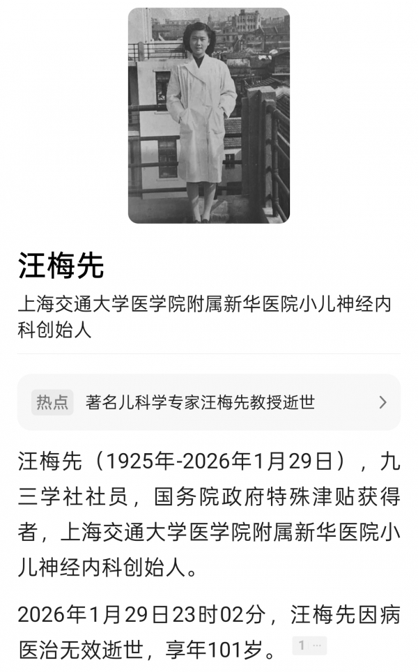 汪梅先教授在2026年1月29日晚上11点02分走了,享年101岁。她是在新华医院病房里安静离开的,没有轰动,没有喧哗,就像她这一辈子做事的样子--认真、细致、不抢风头。她不是那种天天上新闻的人,但只要提起中国小儿神经科,医生们都会说:"那是汪老师打下的底子。"