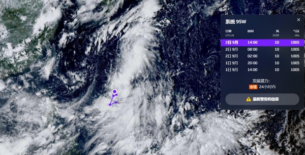 当下来看,西北太平洋区域的确有一个台风胚胎,编码为95W,依照趋势来看,它往北上发展,而我国其实就是说得这个台风胚胎,就是在菲律宾东部区域。