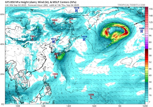 而从EC的情况来看,预计可能在5日的时候,在日本中部区域增强出来,并且达到8级-9级左右,过后偏向北部,减弱变为温带气旋。而从GFS的情况来看,时间稍微快一点,预计在4日左右有可能出现,并且也是偏向于日本方向。