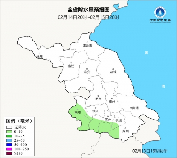 2月15日20时至2月16日20时:沿淮及以南地区阴有小到中雨并渐止转阴到多云,其中苏南地区雨量中等;淮北地区阴到多云。最高温度:苏南地区9℃左右,其他地区7~8℃;最低温度:淮北北部地区0~-1℃,本省东南部地区4℃左右,其他地区2~3℃。全省东北风5级阵风6-7级。