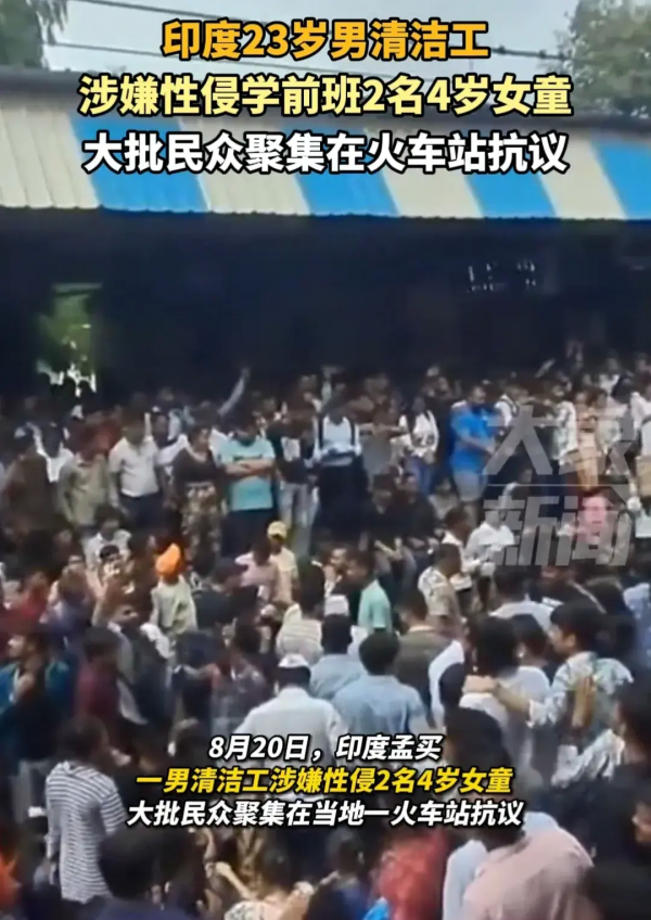 印度孟买一清洁工涉嫌在厕所性侵两名4岁学前班女童,引发大量民众聚集抗议。该男子现年23岁,是某学校的保洁员,利用两名女童去厕所的时间,趁机在厕所性侵女童。其中一女童告知家长,经过检查,确认事实,目前该男子已经被逮捕。