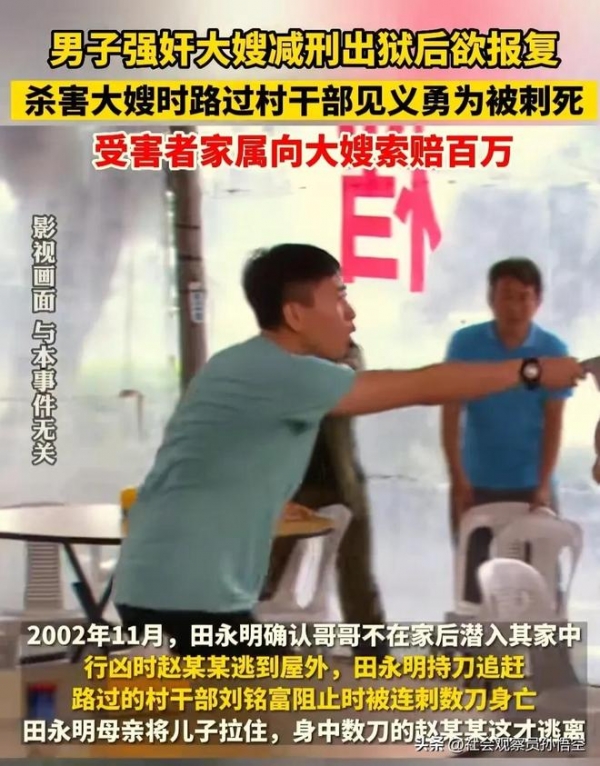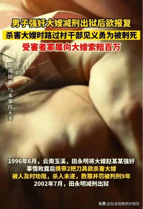 7月份刚出狱,在2002年11月份,田永明伺机而动,又跑到大嫂赵某某家,欲将其杀害。