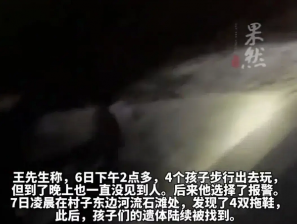 王先生意识到事情有点不对劲,立即把家里亲朋好友叫来帮忙一起寻找,可几个小时过去了,依然没有任何线索,这时王先生开始慌了,害怕孩子们出事,想尽快找到他们,于是,当晚9时许,他报了警,警方和当地村委听说4个未成年孩子失踪,非常重视,立即连夜组织大批人手四处寻找,终于,次日凌晨在村子东边河流石滩处,有人发现了4双拖鞋,后经王先生确认,确实是他家孩子们的鞋,此时王先生突然有一种不祥的预感,大家开始围绕河流重点寻找,果然,孩子们的遗体陆续被找到,4个孩子无一幸免,全部遇难。这么小的孩子,实在太可惜,太可怜了!