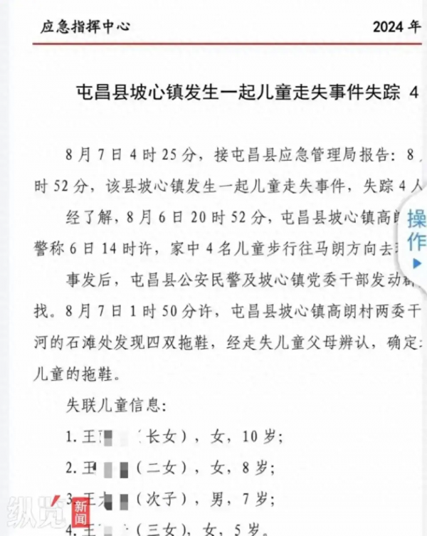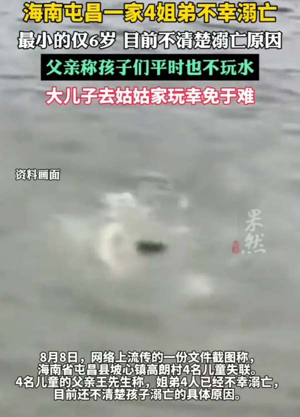8月6日下午14时许,海南屯昌县坡心镇,王先生的4个孩子,姐弟4人,从自家所在的高朗村,一路步行,走走停停、打打闹闹、有说有笑的向隔壁的马朗村方向走去,像往常他们出去玩耍,天黑了自然会回来。但这次他们姐弟4人出去了就再也没回来过,连天黑了都熟视无睹,不见踪影。