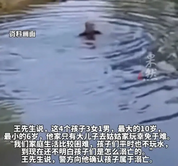 据王先生讲述,他们家生活不富裕,比较拮据,孩子们没有钱去学习游泳,因为不会游泳,所以,平时孩子们也不会去玩水,他到现在都不敢相信孩子们溺水的事实,实在想不明白他们是怎么溺亡的。不过,不幸之中万幸的是,王先生还有一个大儿子当时去姑姑家玩幸免于难,从王先生几个孩子年龄的间隔来看,他的大儿子应该是在11岁至12岁之间,同样未成年,这么看如果当时大儿子在场,情形估计也是非常危险。也有可能他大儿子救了所有人,当然,这都是假设的场景。