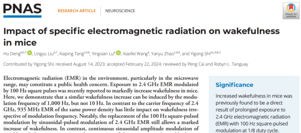 进一步研究中,学者将小鼠暴露于2.4 GHz EMR,峰值功率为64 W,时间平均功率密度为8 W(1/8占空比),由100 Hz方脉冲调制,观测到小鼠显著增加了觉醒效应。