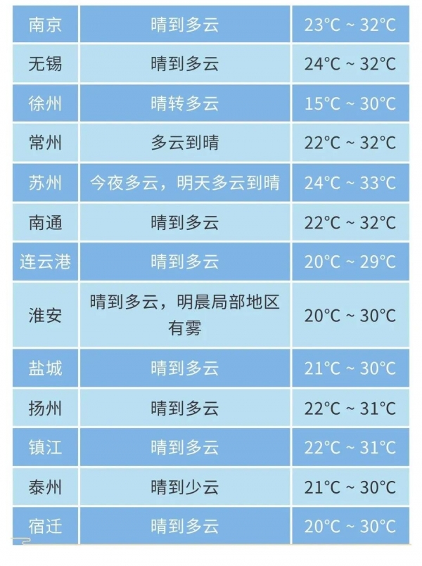 淮北北部地区阴有阵雨,其他地区多云。最高温度:苏南地区32~33℃,淮北北部地区25℃左右,其他地区30℃左右;最低温度:沿江和苏南地区23~24℃,淮北北部地区18~19℃,其他地区22℃左右。全省偏东风4级左右。