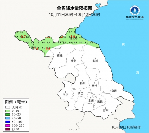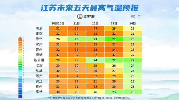 未来10天全省平均温度较常年同期:沿江和苏南地区偏高5-6℃,淮北地区偏高2-3℃,其它地区偏高4℃左右。15日起有1次冷空气过程影响江苏,过程降温幅度3-7℃。