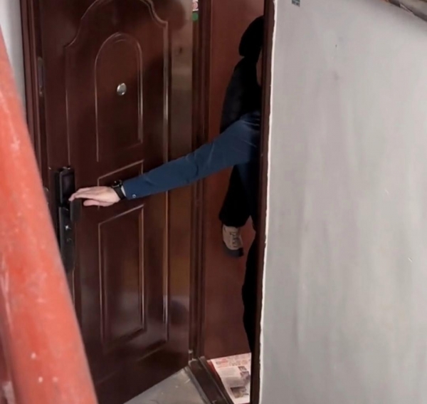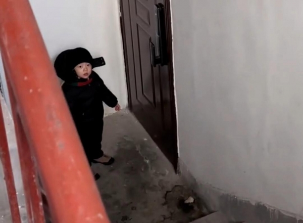 从画面中可以看到,男子抱着一个三四岁的男孩,来到一栋老式居民楼,把孩子放在门口,敲了敲门,就立即爬楼梯到上面一层,伸着脑袋偷偷观察。