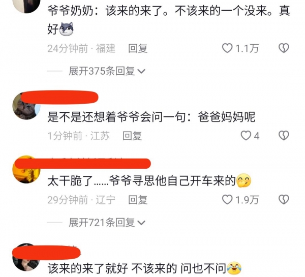 有网友评论说,爷爷奶奶再高兴不过了,该来的来了,不该来的一个没来,干嘛还要问你,这不是给自己添堵吗?