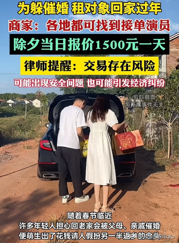 2026年春节前后,不少年轻人在朋友圈发"今年对象定了",点开一看,是张合影,背景像是云南某个小县城的祠堂,其实这人是花三千块租来的,除夕当天开始干活,初一吃完早饭就离开,有商家明码标价,日薪从五百块起算,偏远地方还要加收路费,还附带赠送一套话术包,用来应对亲戚们连珠炮似的问题,比如什么时候买房、他爸妈做什么工作。