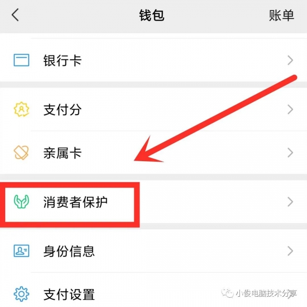 接着在服务页面里面,我们直接点击这个钱包,点开钱包之后,在最下面就可以看到一个【消费者保护】,我们点击一下