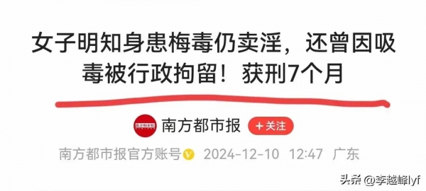 而至此,被警方抓获后,他已经从事约半年的卖淫活动,并且期间接待客人约70位,可想而知,在其被抓捕归案后,这70名嫖客将有可能无知无觉中把性病传染给了家里的钱,无数家庭因为她而破裂。
