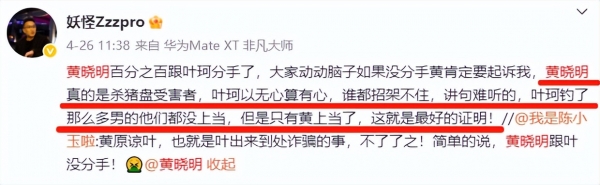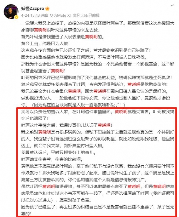 4月24日,博主"妖怪"曾发表长文痛斥叶珂设局,让黄晓明陷入了一场"杀猪盘"。