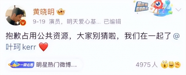 2024年9月19日,网络传闻黄晓明与女网红叶珂恋爱两年后,两人终于官宣恋情。