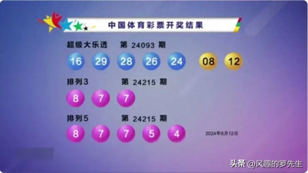 12日晚上万众瞩目的24093期超级大乐透开奖揭晓!前区号码一区轮空,前区号码是16 24 26 28 29,后区紧跟08 12。