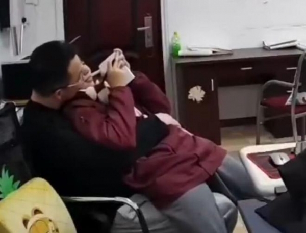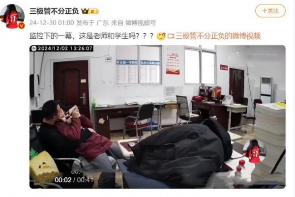 12月30日,一名昵称叫"三极管不分正负"的博主,在社交平台发布了一条视频,视频中,一名年龄三四十岁的男子,坐在沙发上搂抱一名年龄不大的女生,关系亲密,细看视频后发现,亲密场所,竟然是一所高级中学。