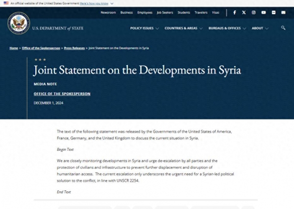 声明称,"目前的局势升级表明,迫切需要根据联合国安理会第2254号决议,开展由叙利亚人主导的解决冲突的政治进程。"
